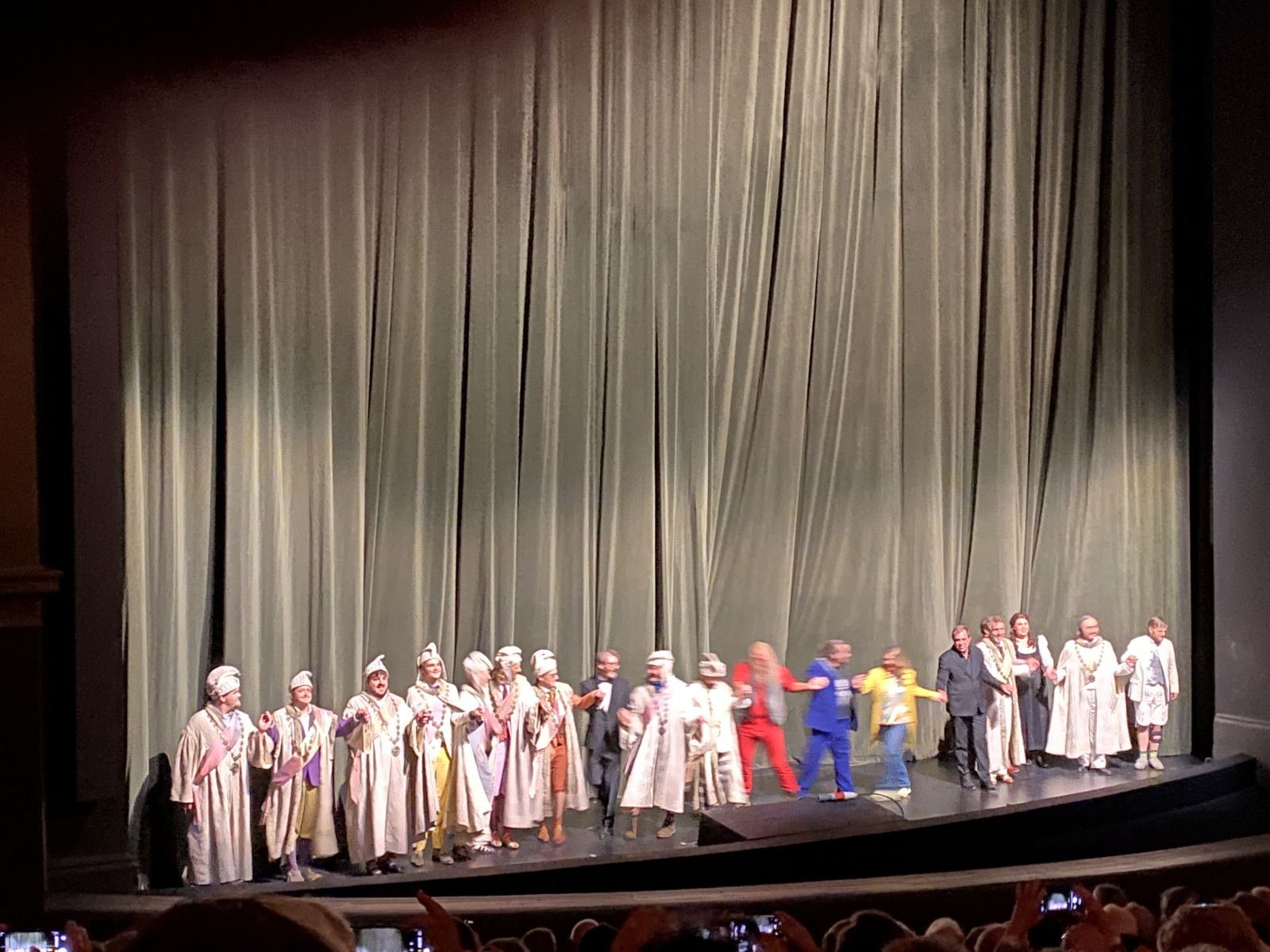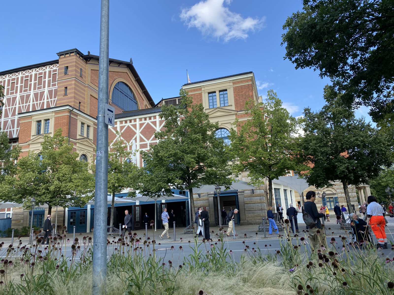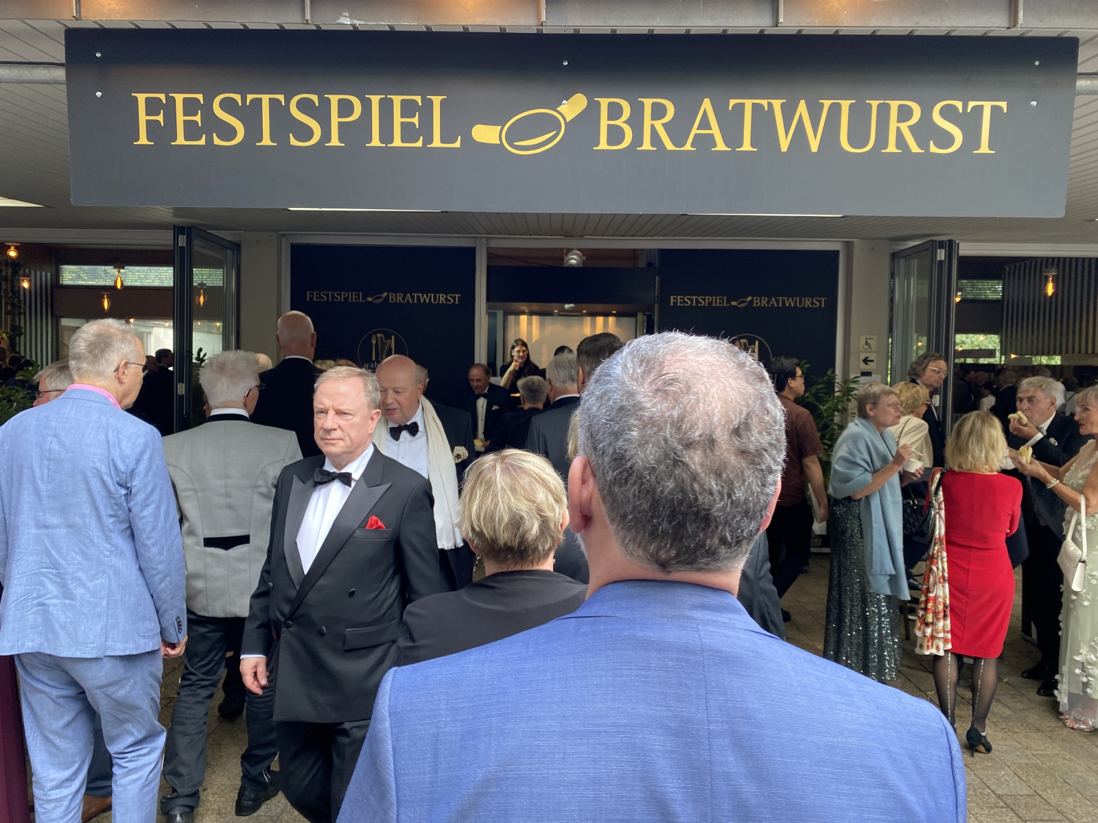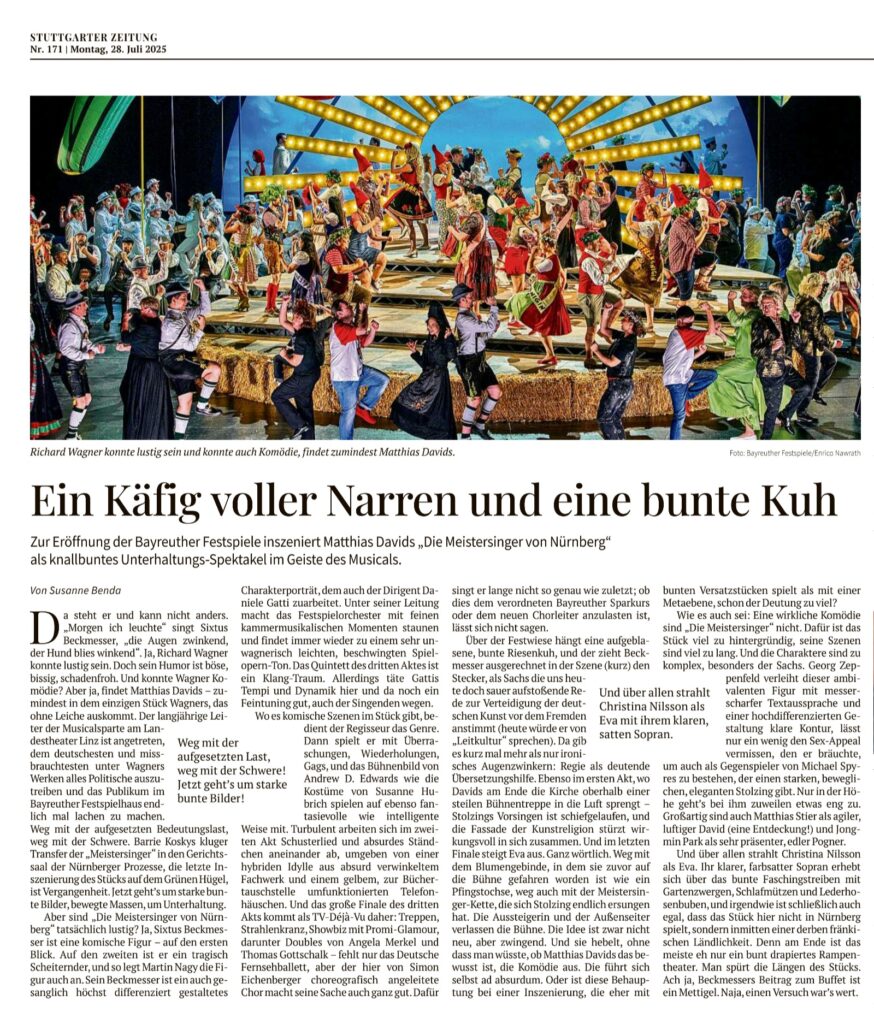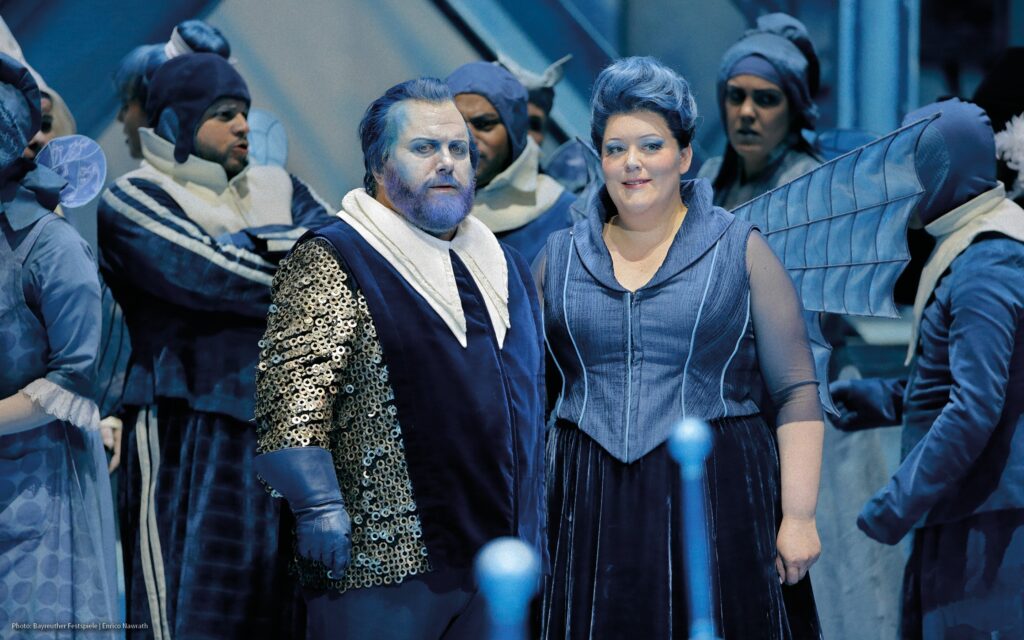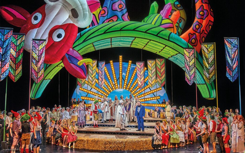 HANDOUT – Dieses von den Bayreuther Festspielen zur Verfügung gestellte Foto zeigt Irene Roberts (Venus, 2.v.l), Manni Laudenbach (Oskar, 3.v.l), Le Gateau Chocolat (l), Klaus Florian Vogt (Tannhäuser, 3.v.r), Elisabeth Teige (Elisabeth, r), Günther Groissböck (Landgraf Hermann 2.v.r) und den Chor der Bayreuther Festspiele (im Hintergund) im 2. Aufzug der Oper «Tannhäuser» von Richard Wagner auf der Bühne. +++ dpa-Bildfunk +++